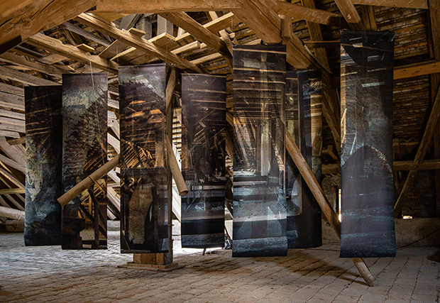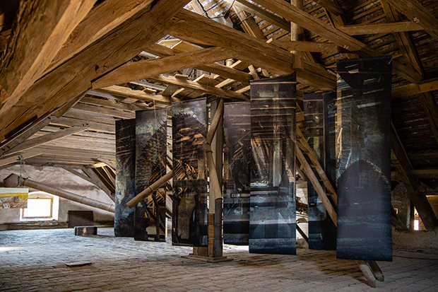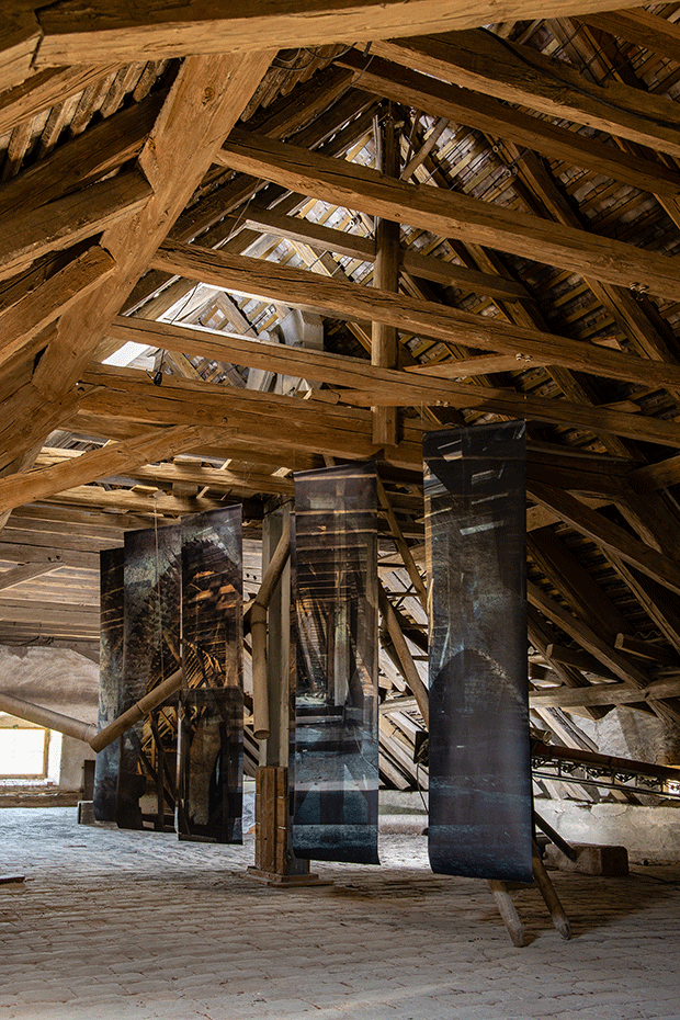 As if … #2, 2022, spatial wallpaper installation in the group exhibition "AMPHIMELAS – Weltschmerz reloaded", latex print on wallpaper, acrylic colour, 270 × 550 × 220 cm, Schüttkasten Schloss Schrattenthal, Schrattenthal / Lower Austria (photographs: Bettina Frenzel)