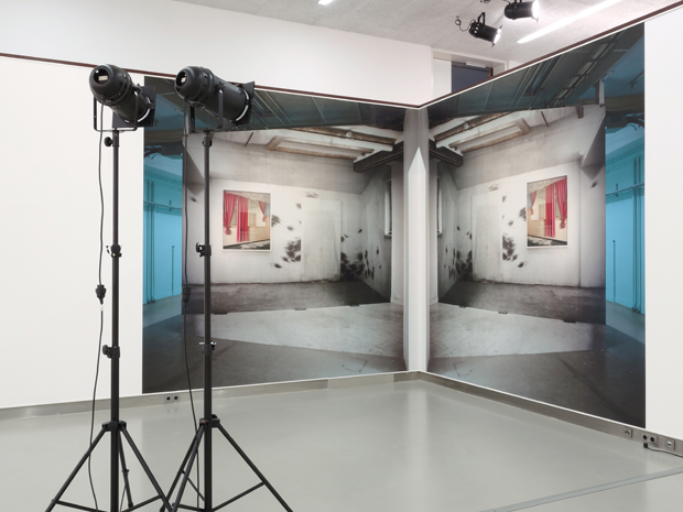 … Ebenso ambivalent gibt sich die Fototapete, die man in ihrer Monumentalität als eine Art installatives Bild sehen kann. Gezeigt wird ein menschenleerer Raumteil mit einer früheren Installation von Czihak: rechts die Ansicht und links das spiegelverkehrte Motiv. Auch dieser Raum gibt keinen deutlichen Verweis auf die zugrunde liegenden Umstände. Optisch wird der Raum der Kunsthalle erweitert, denn der Tapetenraum tritt so plastisch hervor, dass wir glauben, diesen betreten zu können und vielleicht sogar nach hinten weitergehen können. Czihak hat hier zahlreiche Raumebenen geschaffen und durch deren Verschränkung Bewegung in die eingefrorene Situation gebracht. Neue Wahrnehmungsmöglichkeiten räumlicher Strukturen eröffnen sich. Neben dem Raum des Tapetenmotivs gibt es noch den auf dem ‚Foto im Foto’ dargestellten Raum, den durch die Spiegelung entstandenen neuen Raum sowie den künstlerisch bespielten Ausstellungsraum – ein irritierendes Spiel, das durch die Spiegelverkehrtheit und die beim diagonalen Vorbeigehen erfahrbare optische Verschiebung des Tapetenraums noch potenziert wird. … (Petra Noll, aus der Eröffnungsrede zur Ausstellung "Jump the Line")