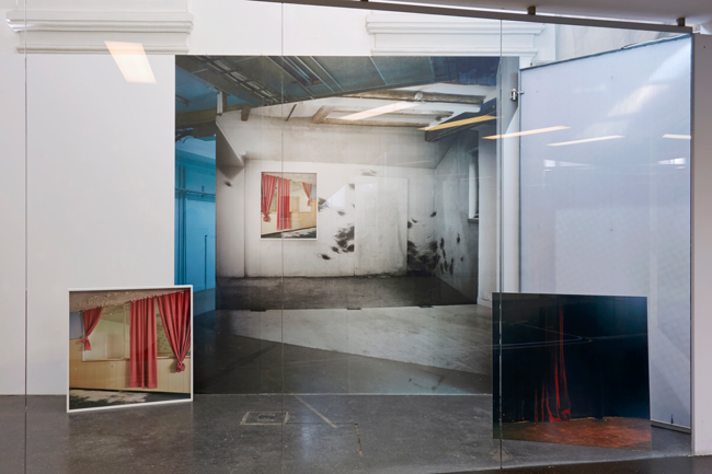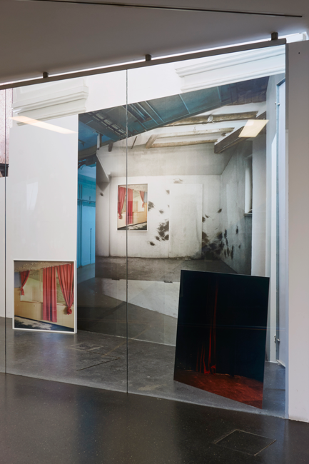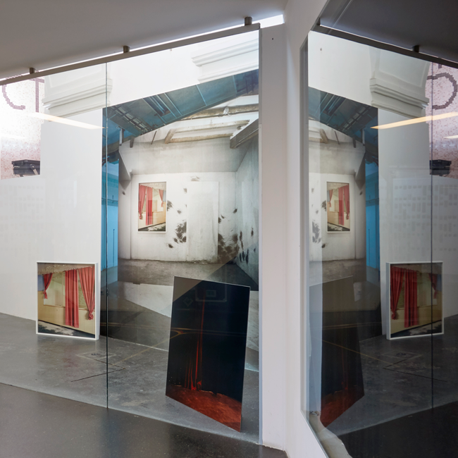 Being in Limbo, 2017, EIKON Schaufenster, Vienna temporary installation with Add-on, a digital print on wallpaper, in combination with the two analog photographs Altrosa, 2008, and Being in Limbo, 2017.